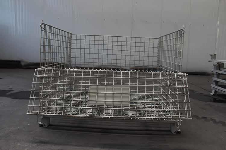 移動式美固籠外形輕巧,籠體除底框外都有鐵絲碰焊成的網片組合而成;網片與網片、網片與底框靠小連接件連接,可活動。且前后面可打開,在堆垛后能取物,堆垛時承重在側面的網片上。該移動式美固籠已完全具備可堆垛性、可折疊性及可搬運性,日益成為物流流通的一種重要物流容器。